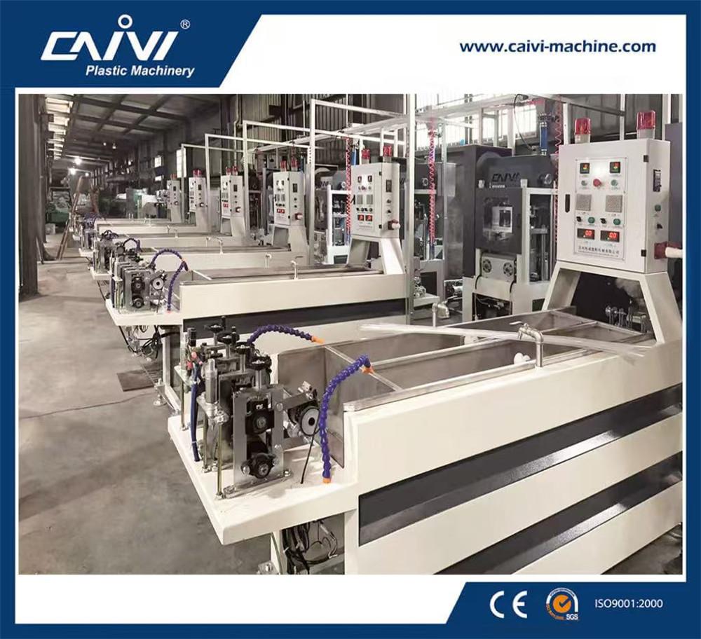 此生產(chǎn)線可生產(chǎn)10-63mm各種直徑和壁厚的PEX-A管材。設(shè)備主要包括雙螺桿擠出機(jī),管材擠出模具,真空定型水箱,噴淋冷卻水箱,牽引機(jī),切割機(jī)和成品堆放架。